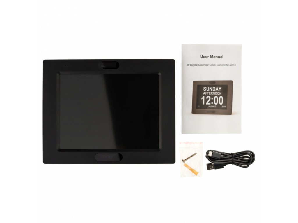 Diskrétní fotopast do interiéru, 2K rozlišení (2304x1296px), úhel záběru 120°, PIR detekce pohybu, neviditelný noční přísvit, baterie 10.000 mAh, trvalé napájení, barevný displej 8", zobrazení fotek a hodin s kalendářem, MicroSD až 256 GB