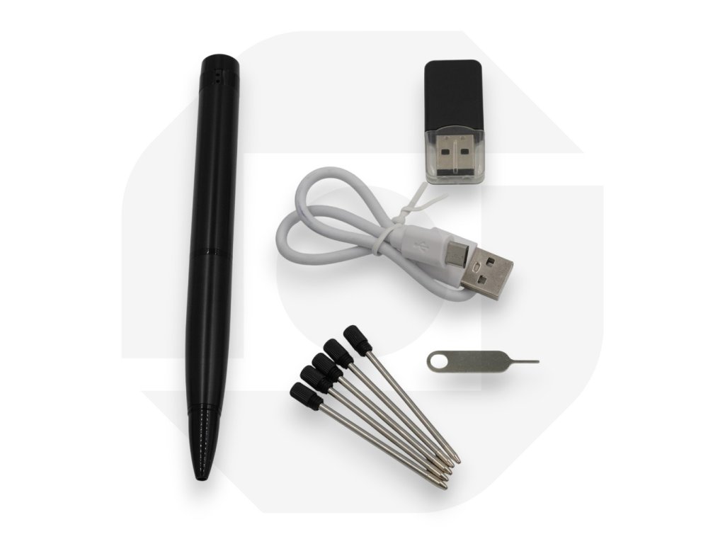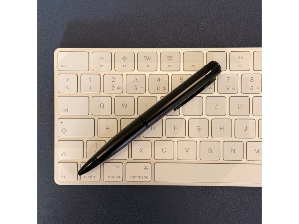 Zcela skrytá kamera v elegantním celokovovém peru, mikro objektiv pod neprůhledným sklem, Full HD obraz, výdrž až 75 minut nahrávání v kuse, citlivý mikrofon, MicroSD karta až 32 GB, píše jako klasické pero